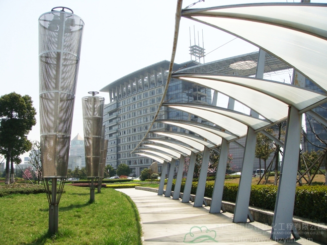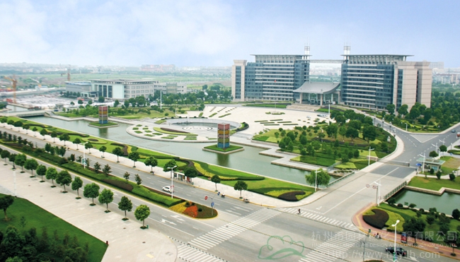 海宁市海洲广场北区Ⅱ标段(绿化工程)位于海宁市行政中心内,区域范围由海洲路、高家桥河、丁桥港一路两河围成,绿化用地123000平方米。该工程为综合性园林工程,分为17个分部,包括园路、林荫停车场、人文广场、林荫广场、亲水平台、浮雕、喷泉、景观亭、景观廊、休息廊、网球场、小方块道路、假山、园形花廊、铺装停车场、绿化工程、给排水工程及电气安装等。