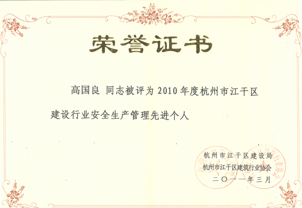 会议旨在总结经验,表彰先进,现场宣读了一批在2010年为江干区经济发展做出突出贡献的建筑企业和个人名单,并颁发了奖牌和证书。其中,公司被评为“2010年度杭州市江干区城市园林绿化优秀企业”,成为上榜的七家企业之一;公司工程总监、市政分公司副总经理高国良被评为“2010年度杭州市江干区建筑行业安全生产管理先进个人”。