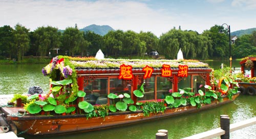艺术节期间,首次在西湖湖面上配置的6艘荷花花船,极大地提高了荷花节的观赏性和趣味性,成为西湖中一道流动的荷花美景。其中,由完美官方网页版设计制作的“魅力西湖”荷花游船,将插花技艺与园林布景手法有机结合,用康乃馨、勿忘我、太阳花等与荷花组景,既突显了“主角”荷花的秀丽、典雅,又使整艘船的色彩明艳丰富,将热闹的节日氛围巧妙烘托。
