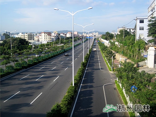 国道205深圳段改建工程景观绿化工程G5402标段,是深圳市龙岗区迎大运重点景观工程,位于国道205深圳段龙岗区地铁三号线爱联地铁站至坪地与惠州市交界处,总绿化面积21万㎡。“以人为本,尊重自然”、“ 处处有绿叶、无处不飞花”等设计理念贯穿于工程始终,整条中央绿化带位于高架桥下,生长茂盛的各类植物形成一条色彩缤纷的彩带拥簇着高架桥段,使整体桥段与绿化景观有机融合。整条道路的景观,不仅体显出一个滨海大都市独有的景观特色,更彰显这个城市的生机活力与热情奔放。