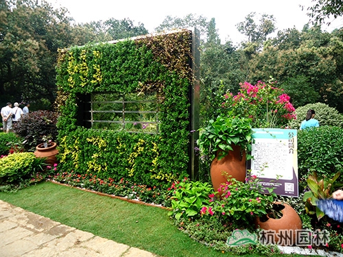 走进画境园,只见主入口左侧种植着两株一高一矮的厚皮香树,郭昌如笑着说,“这两棵厚皮香寓意的是两个万分自豪的森林卫士——熊大和熊二,你看,熊二还满脸热情地向游人不停地招手示意呢。”主入口右侧是一面立体绿植墙,所用的植物主要为黄金络石、金宝石冬青、小叶栀子花、金边黄杨等。“立体绿植墙是立体绿化的主要形式,画境•青山湖花园中心推出的这款立体绿植墙产品,可以根据客户需要,结合气候、温度、湿度、色彩等综合条件,选配四季长绿或色彩丰富的植物,随时在人们想要的地方构建出一个贴近自然又超脱自然的生活环境,可谓是简单又方便。”郭昌如介绍道。立体绿墙的两侧,随意地散落着一些红陶罐,与金宝石冬青、龟甲冬青等精品球形植物,三角梅、月季、常春花、鸡冠花等花卉,紫叶狼尾草、晨光芒、矮蒲苇等观赏草混搭,营造出一种温暖、和煦的庭院景观。“如果把绿植墙看成是城市的建筑,此景则喻意美丽杭城的繁华一角。”郭昌如补充说。绿植墙的中间还别出心裁地设置了一扇窗户,透过它,园内的美景已隐约可见。