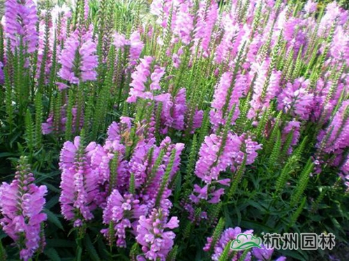 假龙头,茎丛生而直立,四棱形,株高可达0.8米。单叶对生,披针形,亮绿色,边缘具锯齿。花色淡紫红,因其花朵排列在花序上酷似芝麻的花,惟密度稠一些,故名芝麻花。花期7月至9月。养护时每月均需施磷钾肥。