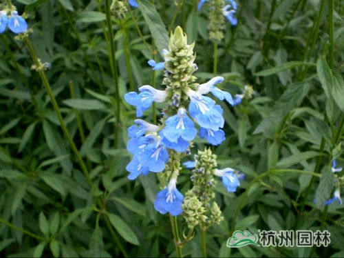 天蓝鼠尾草,花天蓝色,开花植株高达1米5,花期春季。喜温暖,阳光充足的环境,不择土壤,耐干旱,但不耐涝,特别喜石灰质丰富、或沙性、排水良好的土壤。
