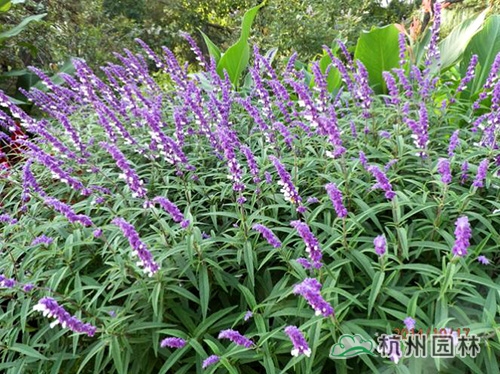 紫绒鼠尾草,茎直立,株高100~160厘米,花期9月上、中旬至霜降。该种适应性强,花期迟,栽培容易,繁殖容易,是一种适合推广的花境植物。需肥量较其它鼠尾草大,需多施基肥。