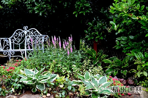 英式花境中,以穗花婆婆纳为焦点,通过花叶玉簪、矾根、柠檬罗勒、红尾铁苋、花叶络石的配置,并与铁艺座椅形成惬意的休闲氛围。