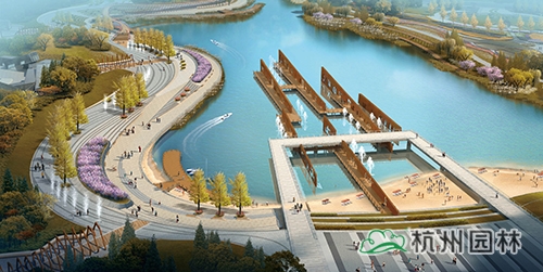 水岸广场:台地张弛有度,将台阶、坡道、草坪、木平台、广场组成丰富的滨水空间,流线型的岸线贯穿整个台地,形成一条观光滨水走廊,结合滨水岸线设置游船码头、亲水平台,形成极具特色的水岸广场。