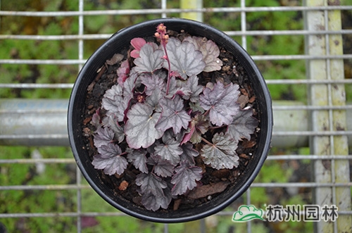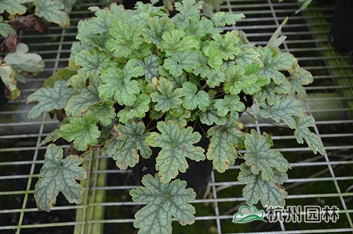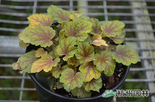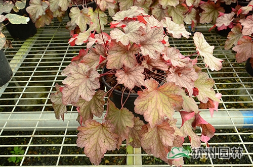 矾根叶形也变化多样,基部心形或楔形,掌状浅裂至深裂,边缘波状,浅根系,叶基生,花期一般为4~10月,花很小,呈钟状,两边对称。幼苗长势缓慢,成苗后生长旺盛。绿期长,能够在-15℃以上的温度下生长。具有喜半荫、耐全光、耐旱性和耐寒性强等生理特点。适宜富含腐殖质的土壤。喜中性偏酸,适宜的PH值为5.8~6.2,能够在倾斜地方生长。冬季不落叶,枝叶生长稠密,株型圆整,覆盖性强,花和叶都比较漂亮。