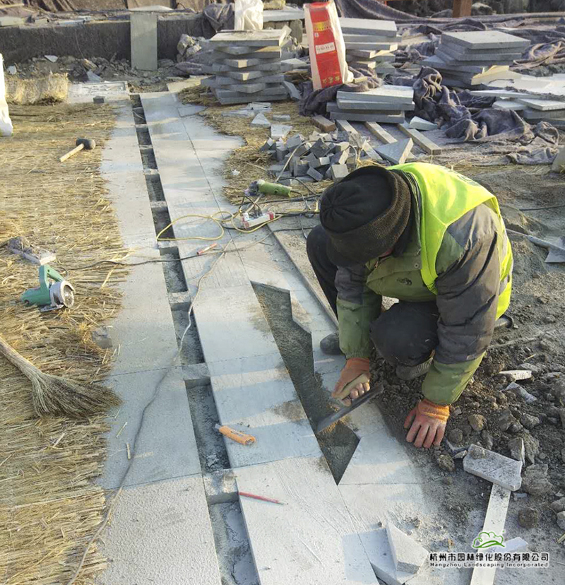 “白天温度在零度以上时,我们趁着太阳出来、温度比较高的时候施工;等太阳快下山时,温度下降很快,这时,我们就停止施工,用毛毡、草垫等将做好的铺装盖起来,再搭上保湿棚保温。因为如果保暖措施做不到位,白天做好的铺装,晚上就会冻坏,导致白天的工作功亏一篑。一些种好的精品树木,如造型黑松,我们就用很厚的棉被包裹起来,以防冻伤。”回忆起当初的施工过程,吴小成依然觉得这是施工中一段时常难熬的时期,“零下15℃的时候,我们还在施工,此时水已经全部结冰,但施工又离不开水,怎么办呢?我们买了一个加热器,把冰放到桶里,再把桶加温化水,以此来满足施工中的用水需求。”