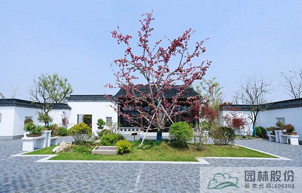 盆景园内,一棵棵造型别致的盆景,是海棠另一种形态的展现。院子中央,高大的‘丰盛海棠’正迎来盛花期,深粉色的花朵密密匝匝布满枝头,成为院中最引人瞩目的风景,与院子里的五棵柿子树搭配种植,组合成“五世同堂”的美好寓意,寓示着日子红红火火、阖家欢乐吉祥。在主建筑旁的天井处,采用盆景化的造园手法,运用南天竹、黑松、石子等元素营造的植物小景,自成一方小天地,与整个盆景园形成“园中园”的关系,展现出造园者的奇妙心思。
