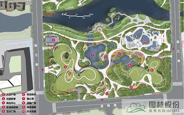 以现有滨河绿道中心景观平台和设计中两大主要景观中心形成主要景观轴,构成东西方向轴线;两处地景建筑主体和其连接景观带形成南北方向轴线。结合东南侧水体作为乐水空间,布置水上乐园。