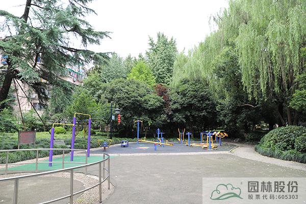 与健身塑胶场相邻的活动场地为水泥地,与整体风格不协调。通过铺设彩色塑胶,地面增加跳方格、跳远、跳房子等图案,地上增加儿童活动器械,形成儿童活动场地。同时对四周的破损卵石园路进行修补,增加户外座椅。