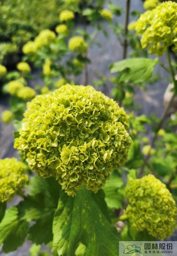 忍冬科荚蒾属,落叶灌木。叶三裂,秋色叶红色。聚伞花序,全为不孕花,花大且繁,花色初开绿色,萌萌如绿豆糕,后逐渐变纯白。植株萌芽力强,耐寒耐热,可耐-30℃低温。生长迅速,适合庭院观赏。