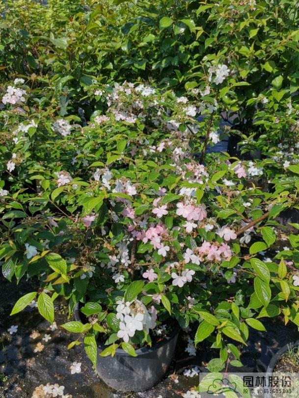 忍冬科荚蒾属,落叶灌木,日本引进,株高可达2.5-3m。新叶成暗红色,后呈绿色,秋色叶颜色多变。整个花序都是不育花,球形,花苞粉绿色,开放后淡粉色,最后变成白色。它适应我国大部分地区种植,生长相对缓慢,适合园艺盆栽或庭院观赏。