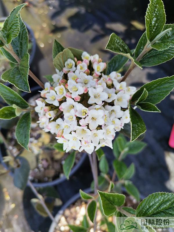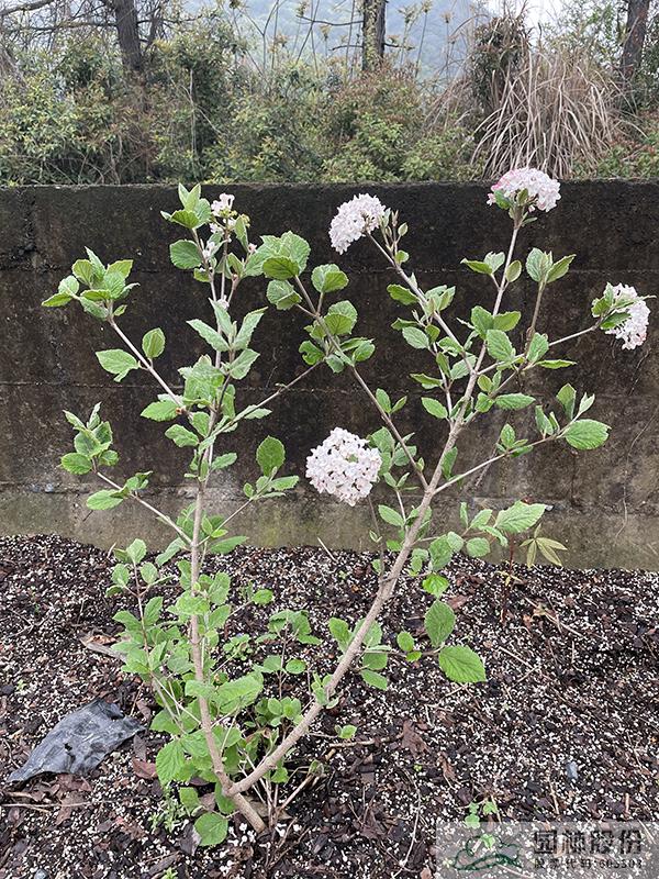 忍冬科荚蒾属,半常绿或常绿灌木,株高2-3 m,为红蕾荚蒾和烟管荚蒾的杂交种。叶色深绿,秋季转红,颜色程度因所处地区而异。该种继承了红蕾荚蒾粉花的优良基因,花序未开放时呈现靓丽的粉色,开放后白色,且具有较浓郁的花香。花径一般4.5-10 cm,花期3-4月。植株具有良好的顶端优势,枝条年生长量大,但分枝能力稍弱。几乎无病虫害。适应性强,生长速度快,耐干旱且耐寒,适合自然风格的工程应用或庭院观赏。
