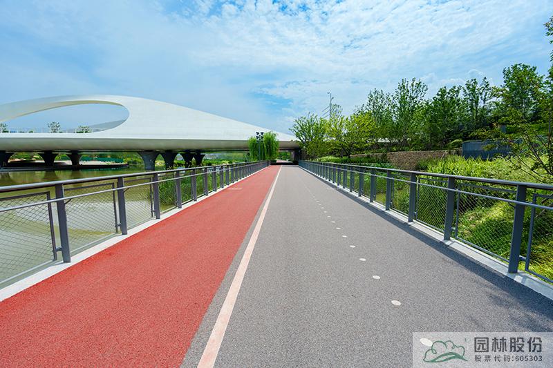 城市绿道通过铺装材质区分出骑行道和跑步道。骑行区域采取沥青材质,提高耐久度和使用寿命,有效控制成本造价。跑步道区域采用EPDM塑胶颗粒面层,提高使用舒适度,采取靓丽的色彩与骑行区域进行区分。结合人才驿站设置瞭望台,游人在此可小憩补充体力,也可登高俯瞰河道景观。造型独特的驿站和瞭望台也是河道上的一处风景。
