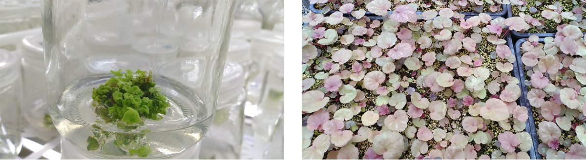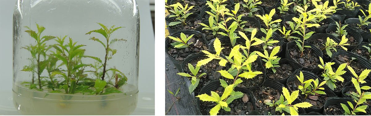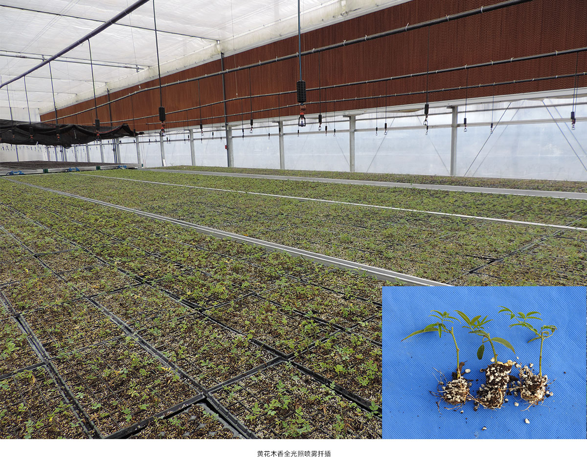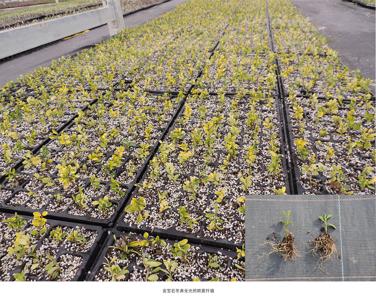 (1)全光照喷雾扦插育苗技术 全光照喷雾扦插技术具有生根期短、成活率高和操作简单等优点。研究院已建立了桂花、冬青、降香黄檀、新优宿根植物等数百种植物的全光照喷雾扦插技术体系,年度育苗量200多万。